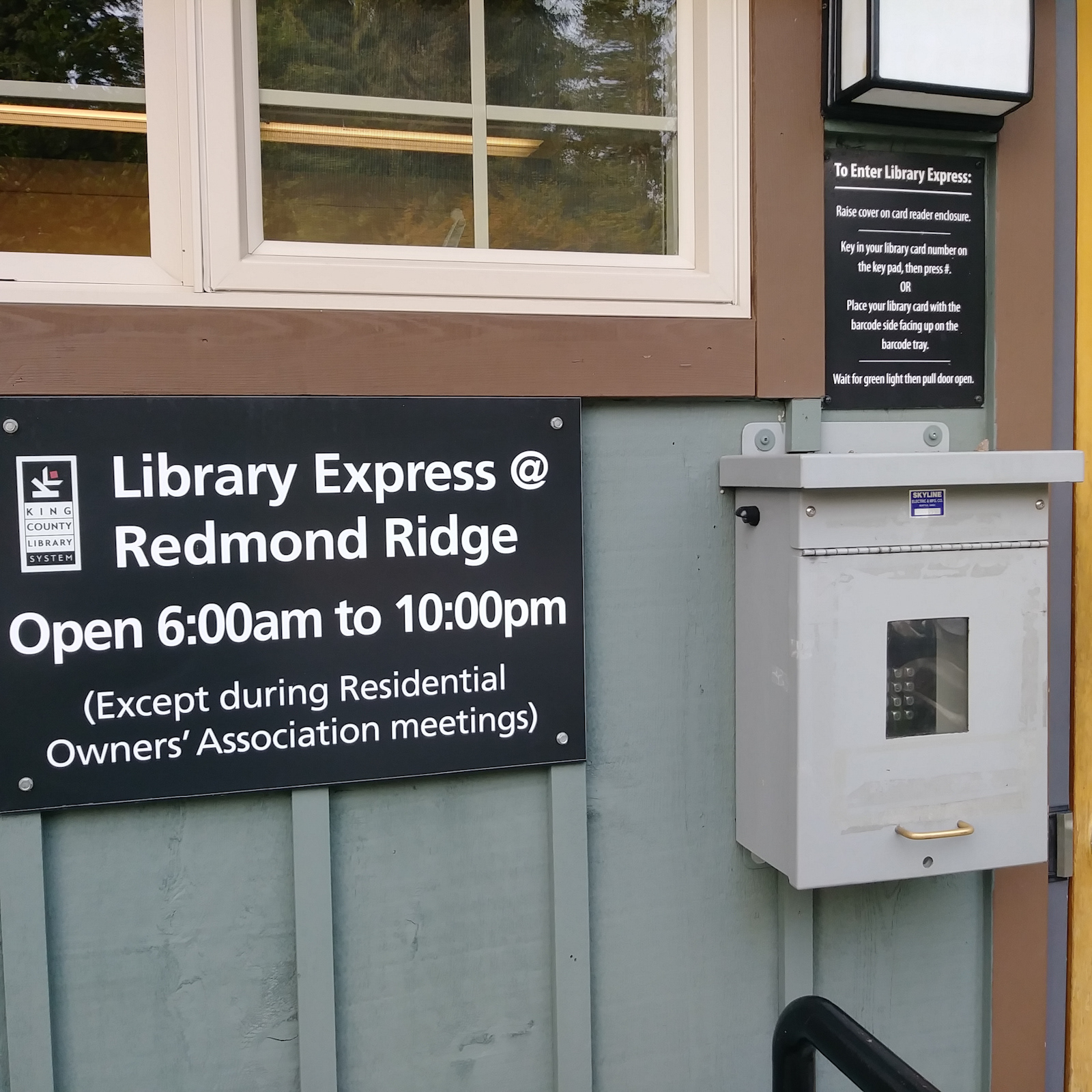 2. Secure key pad entry using library card scan or input number. Extended hours of operation compared to staffed branch was a bonus.