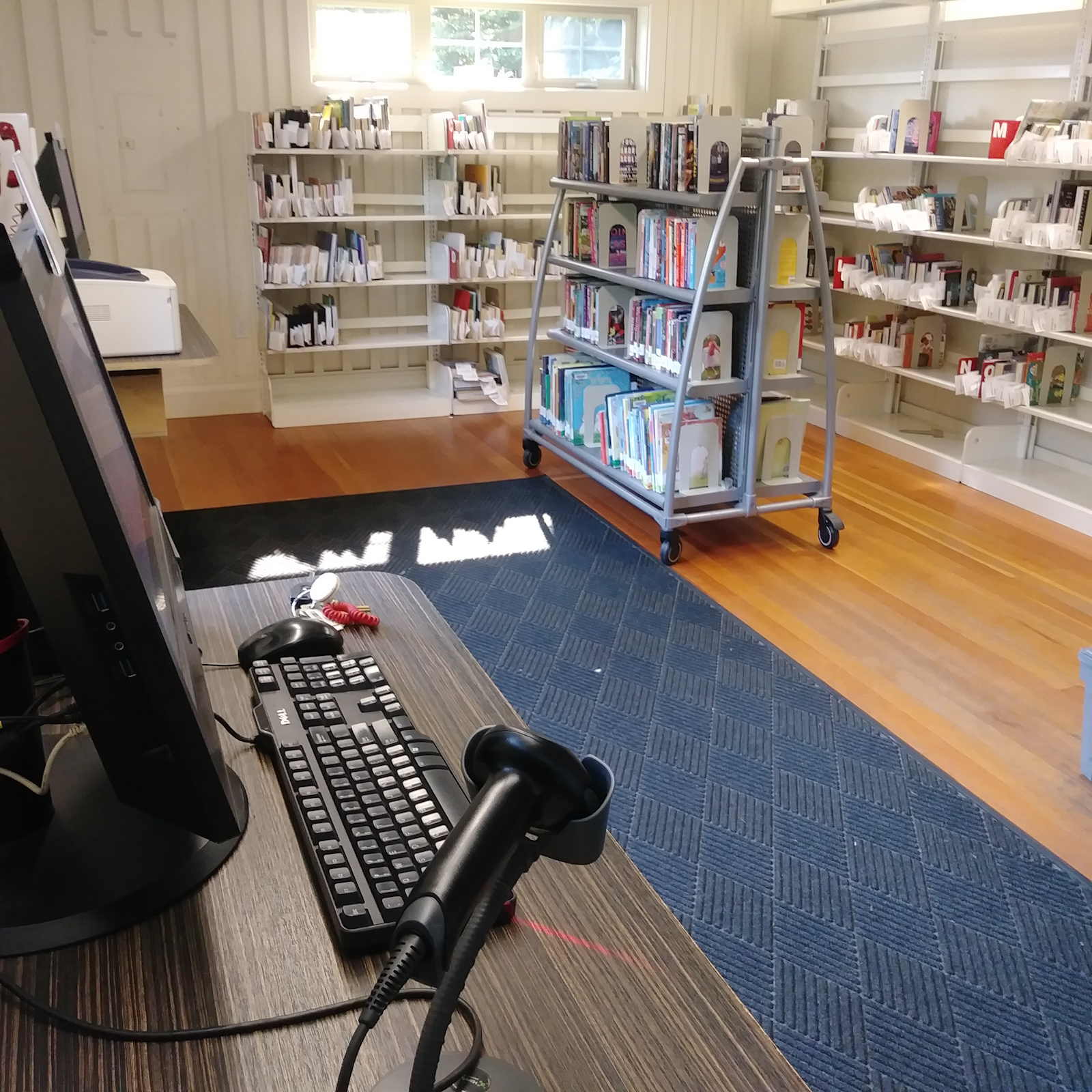4. Interior view. Overflow shelving and checkout computer station in distance. Red phone mounted to the wall is a direct line to the Redmond Branch librarian if assistance is needed