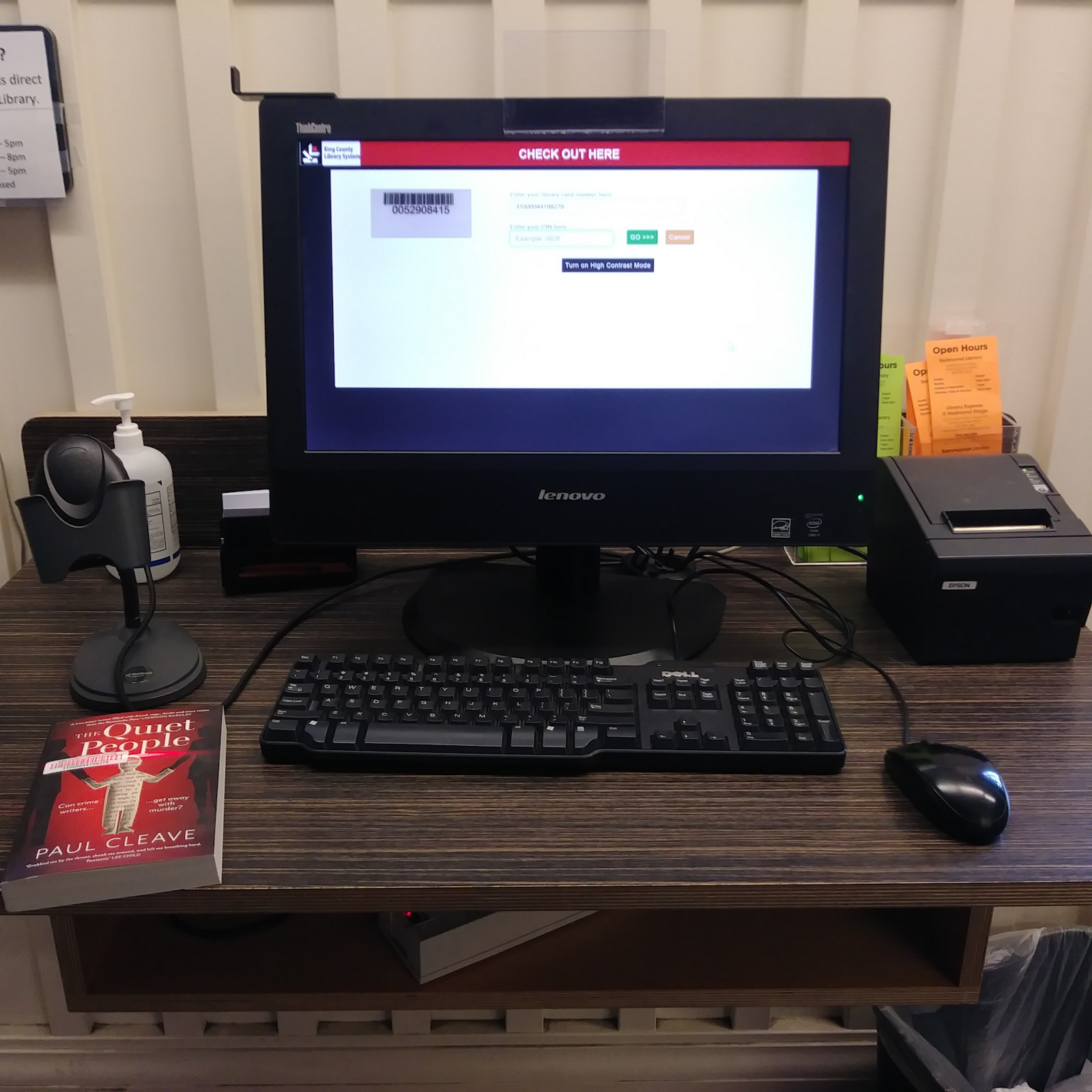5. Check out station. Log in with library Card ID/password. Scan the barcode, proceed to next item or end transaction. Option to print receipt